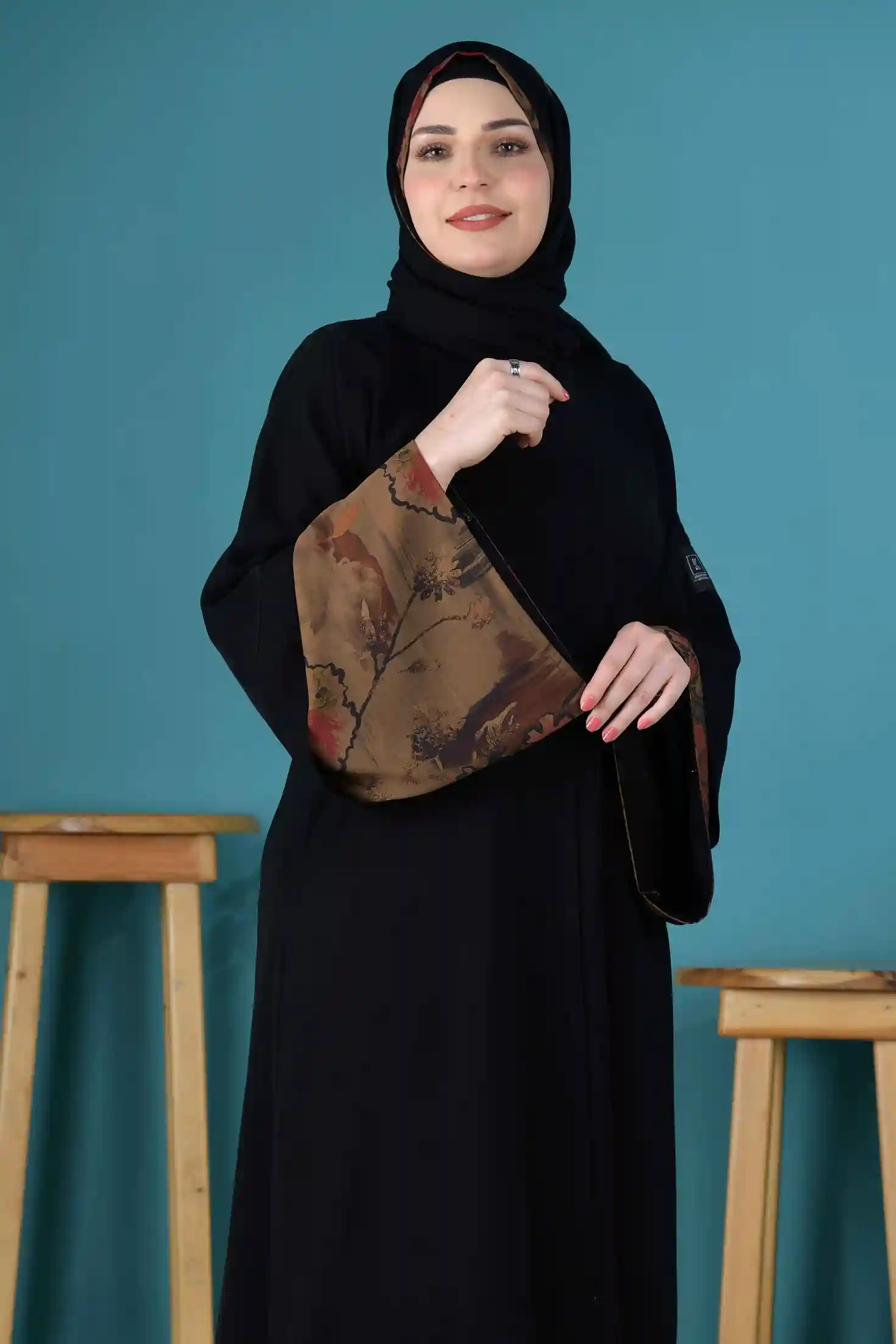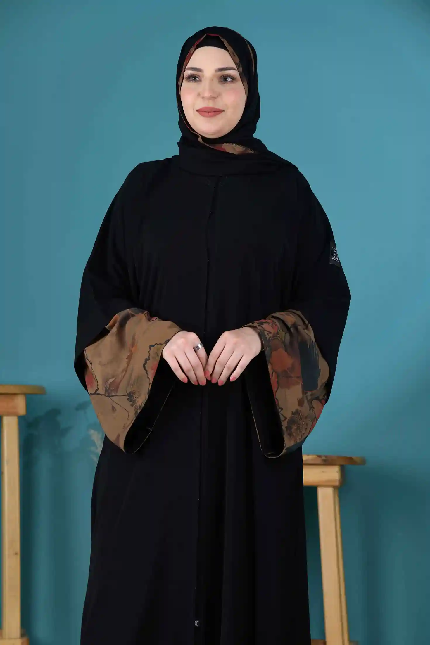 All your choices at Kenan are vibrant and suit you. This abaya features a soft and attractive design, distinguished by its half-butterfly cut and the addition of bright floral fabric inserts at the top and on the sleeves, creating a harmonious and beautiful look.
