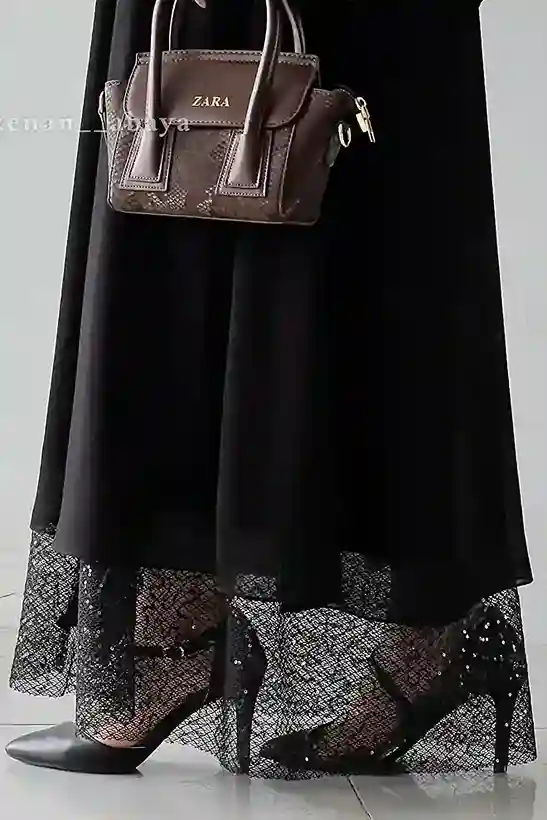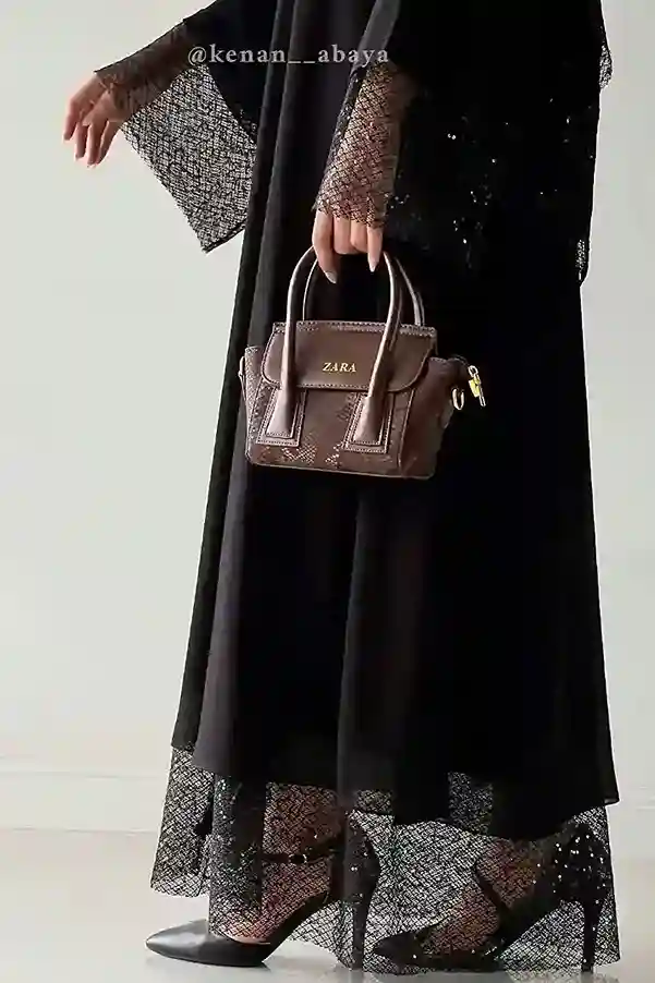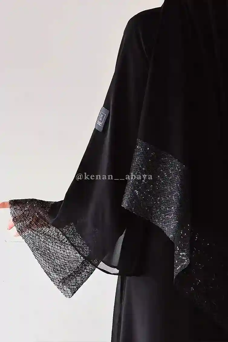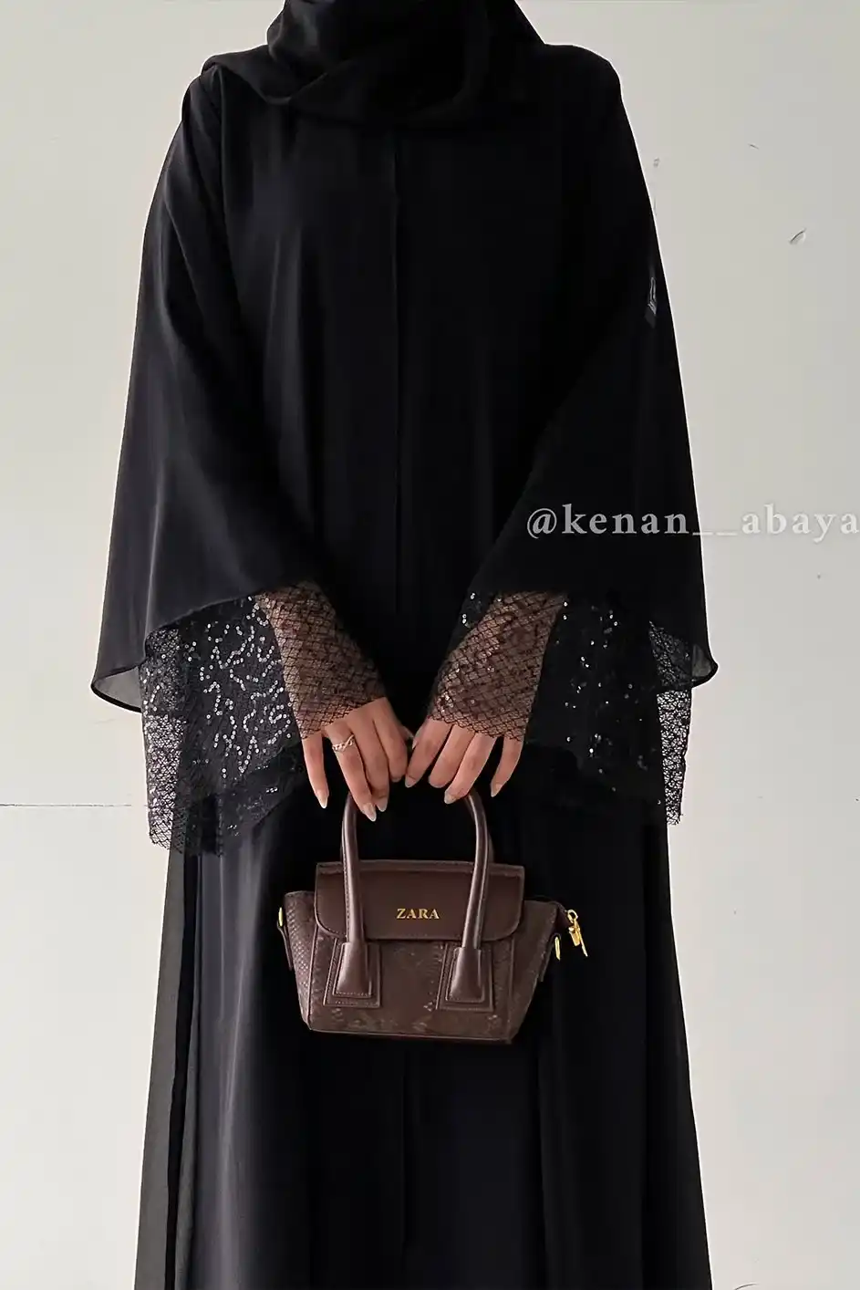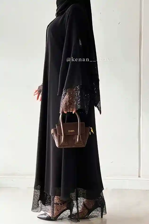 🔹 التفاصيل: حاشية دانتيل قيطان على الأكمام وأسفل العباية وطرف الحجاب