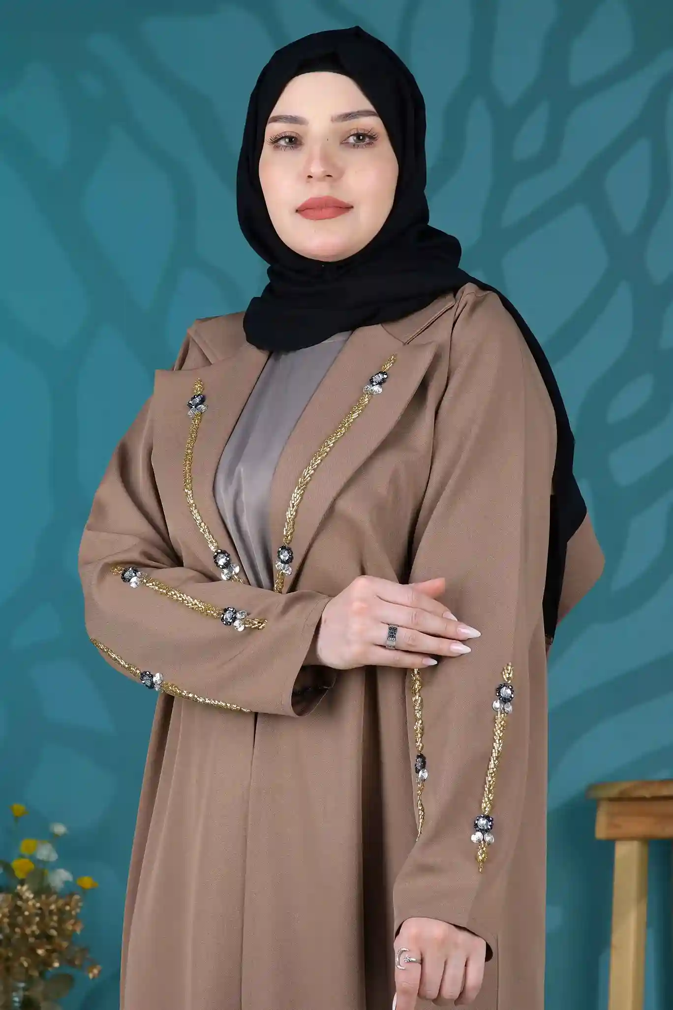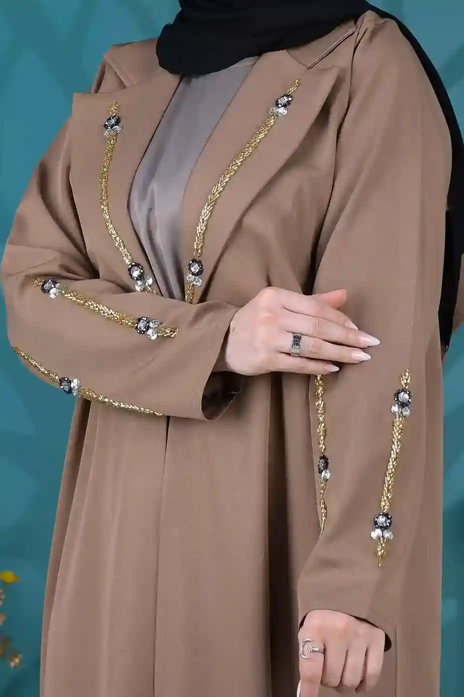 A soft and attractive abaya featuring a half-butterfly cut and embellished with vibrant floral fabric inserts at the top and on the sleeves, adding to its harmony and beauty.