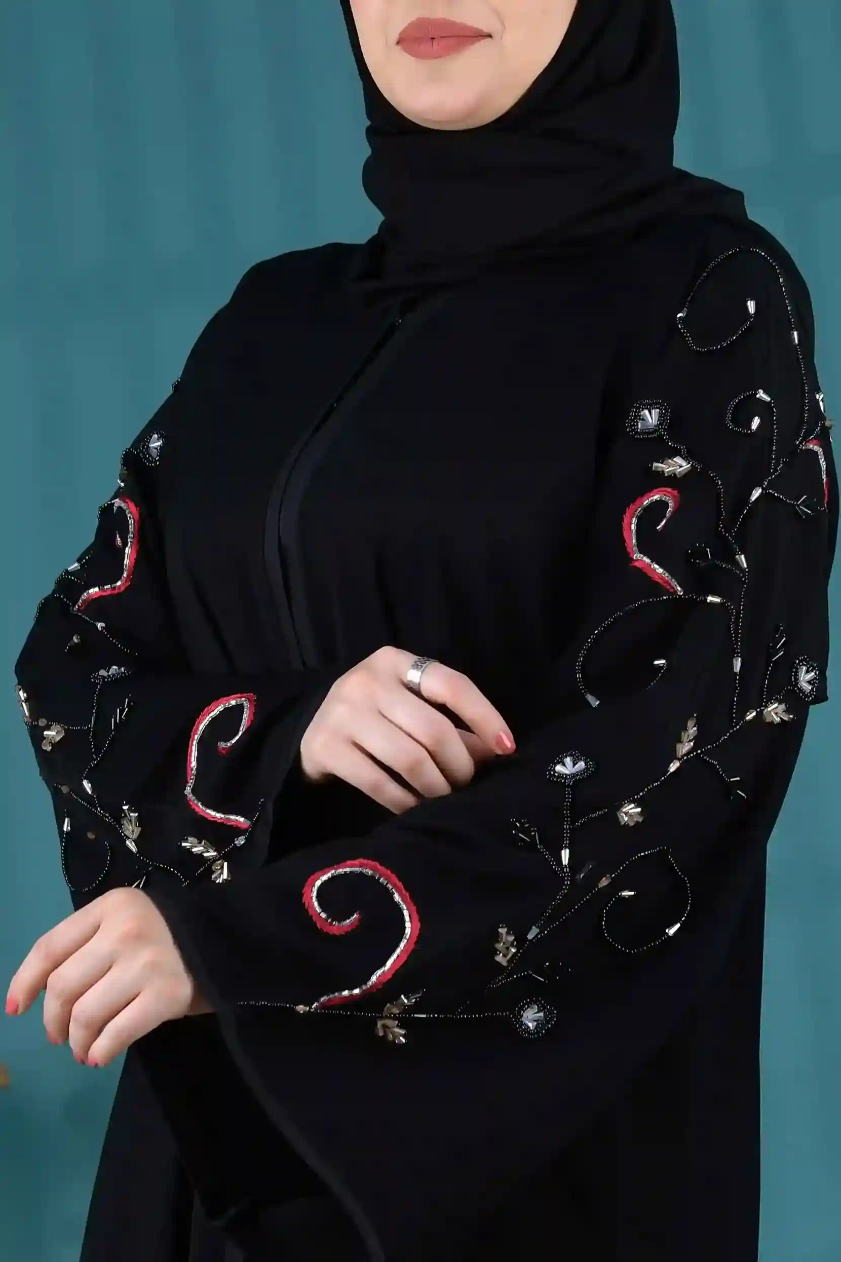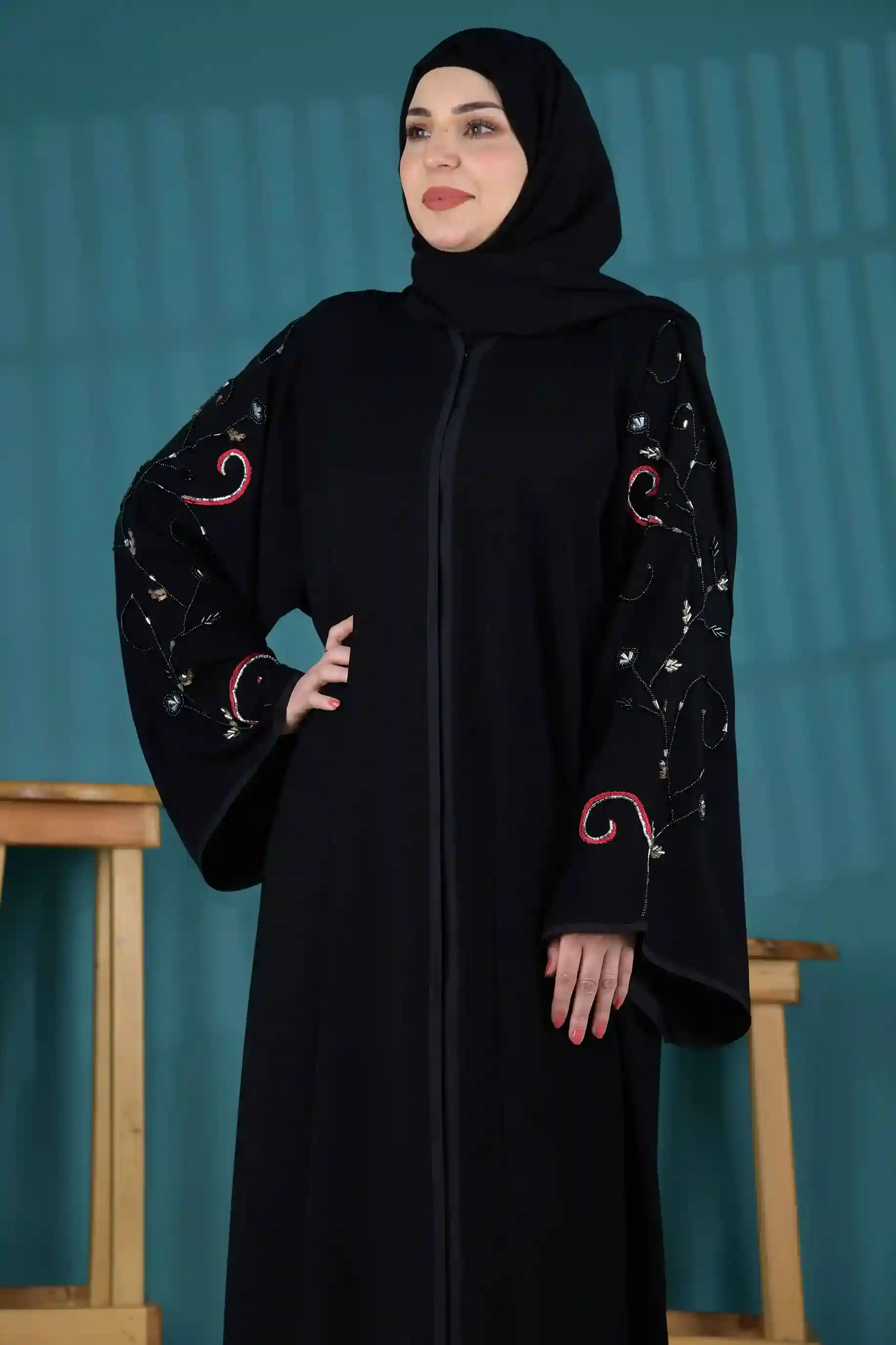 This abaya features a distinctive Gulf-style design with exquisite Indian hand embroidery along the sleeves in vibrant colors.