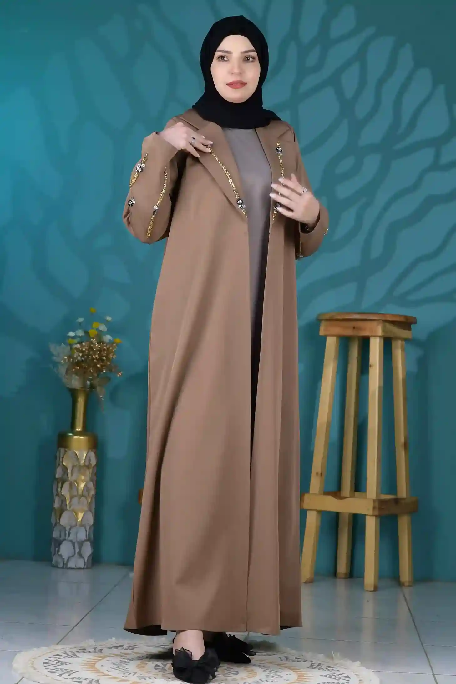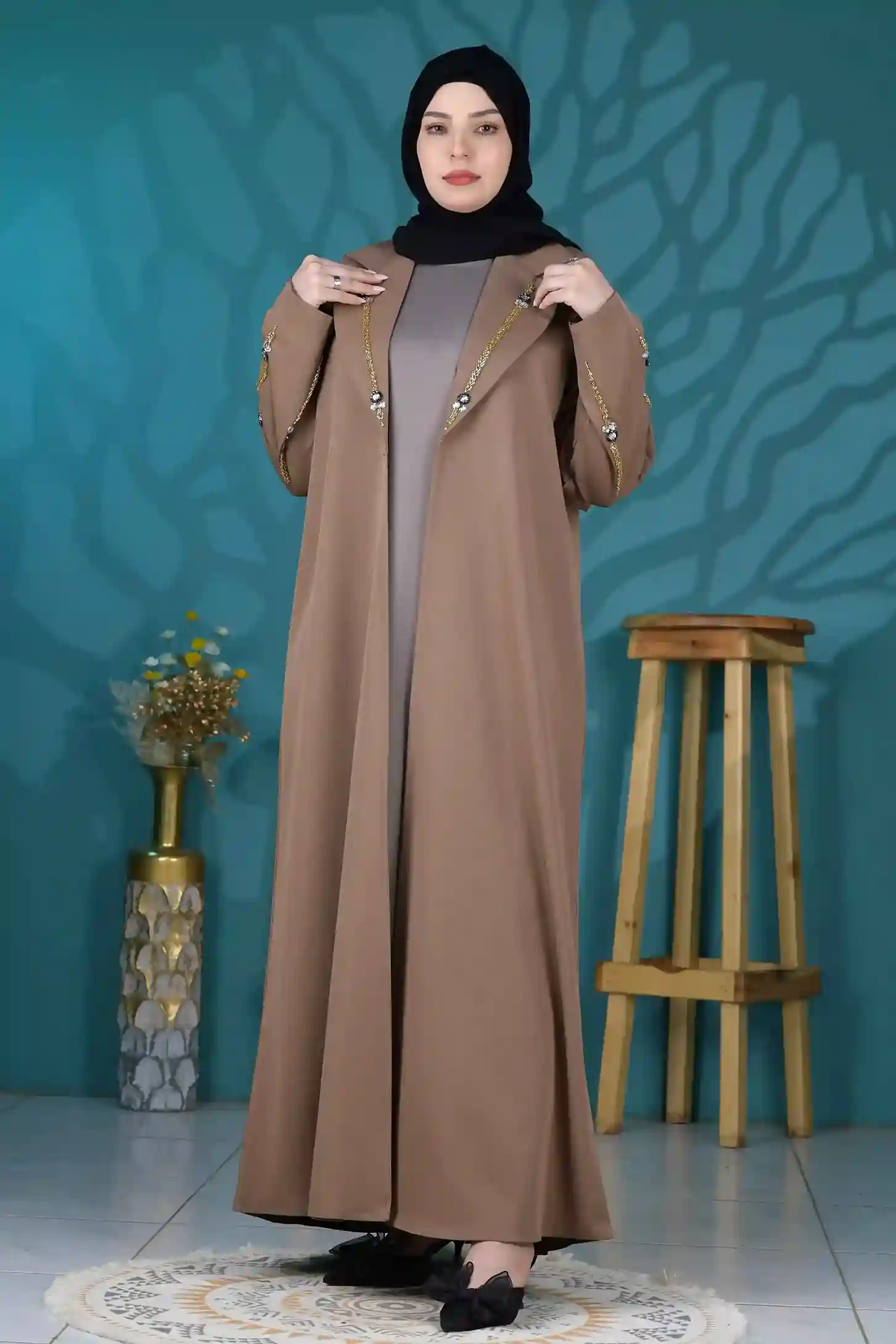 A soft and attractive abaya featuring a half-butterfly cut and embellished with vibrant floral fabric inserts at the top and on the sleeves, adding to its harmony and beauty.
