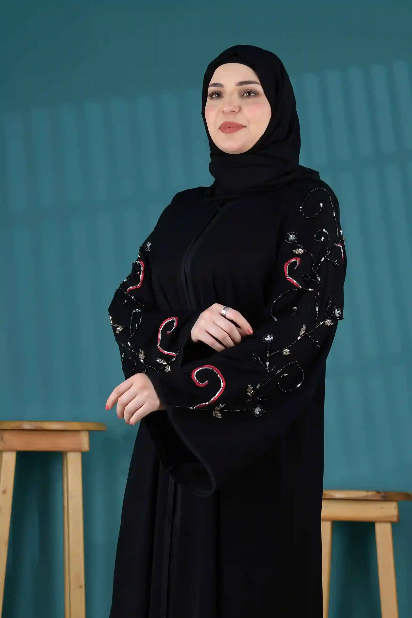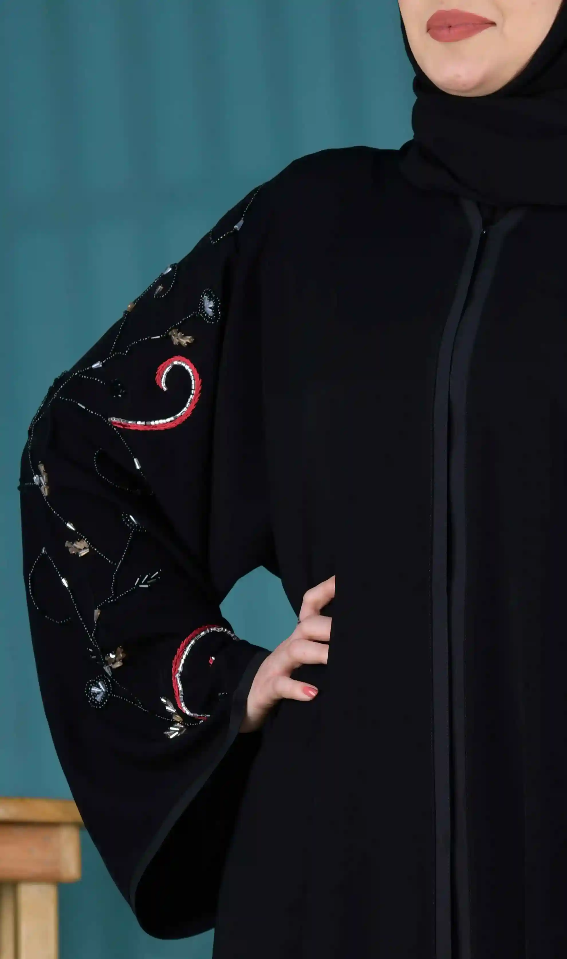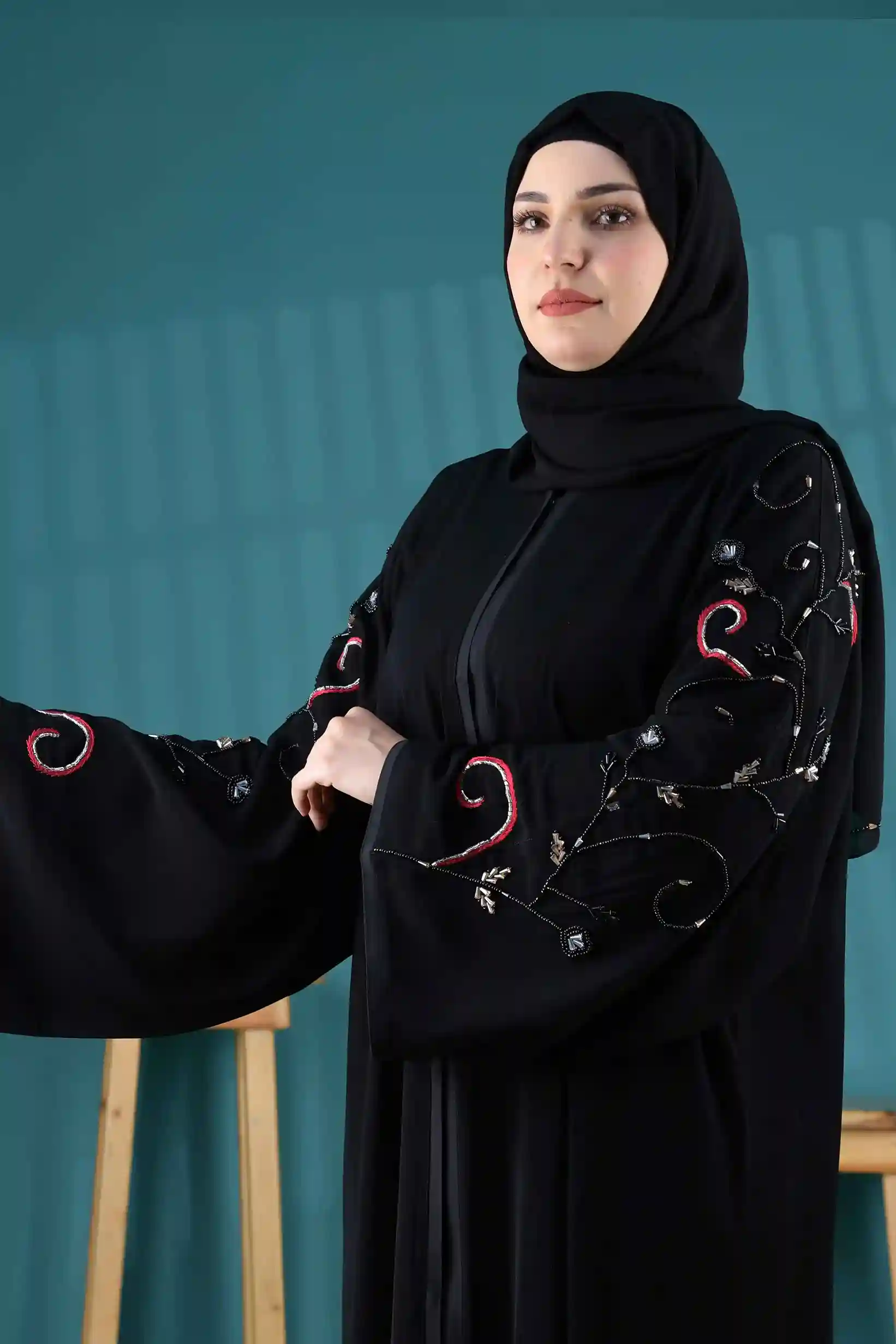 This abaya features a distinctive Gulf-style design with exquisite Indian hand embroidery along the sleeves in vibrant colors.